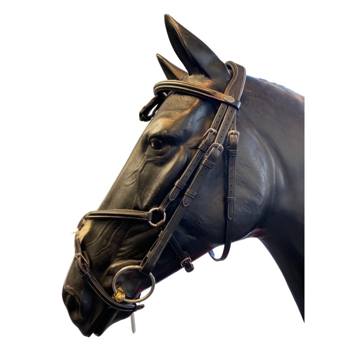 Lækker Trense fra Dyon's working collection i Buffalo læder med anatomisk nakke stykke, polstret næsebånd med natur fåreskinds beskyttelse. Let polstret pandebånd og cremefarvede syninger. Trensen er sort med chrome spænder og ringe.